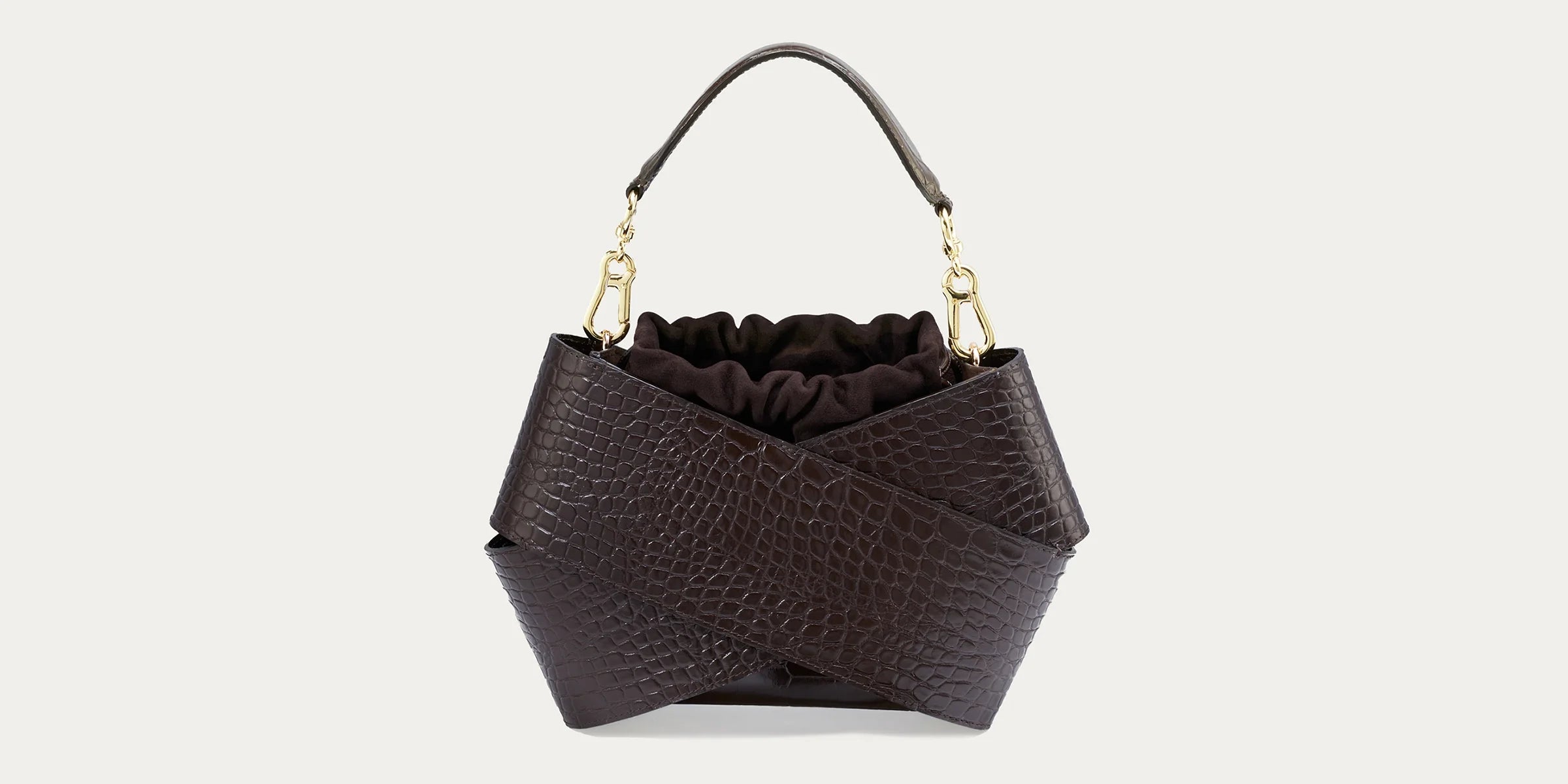 Skórzana torebka o unikalnej formie z dwóch otulających się kawałków skóry to dodatek, który przyciąga uwagę i podkreśla indywidualny styl. Wewnątrz znajduje się praktyczny zamszowy woreczek chroniący zawartość, który można łatwo wymieniać – dzięki temu torba zyskuje nowy charakter i dopasowuje się do każdej stylizacji.