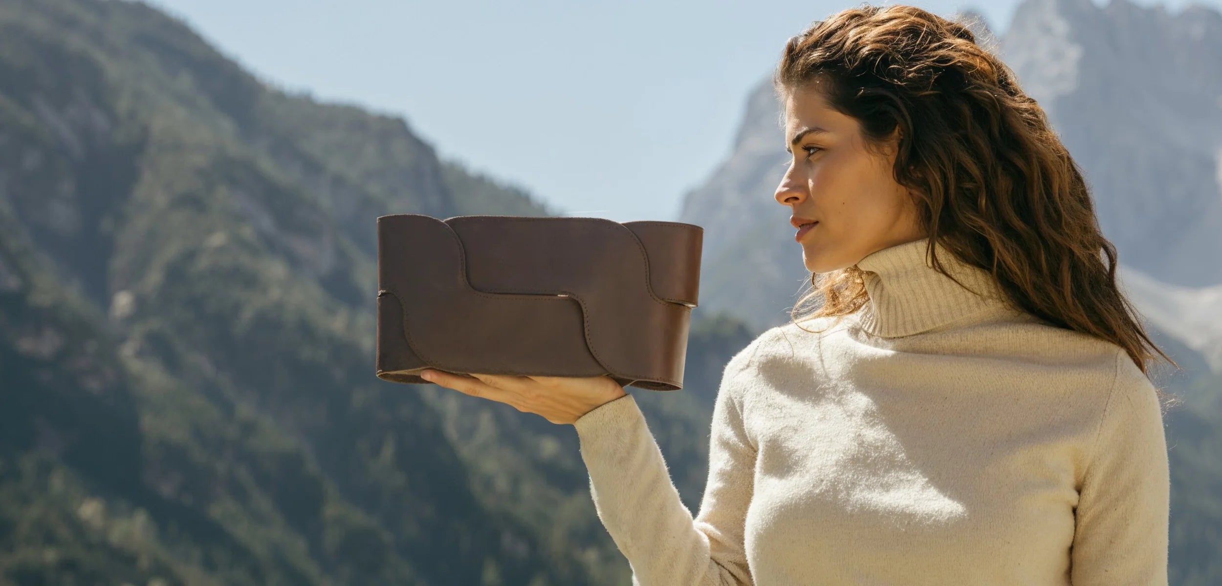 Skórzana torebka o unikalnej formie z dwóch otulających się kawałków skóry to dodatek, który przyciąga uwagę i podkreśla indywidualny styl. Wewnątrz znajduje się praktyczny zamszowy woreczek chroniący zawartość, który można łatwo wymieniać – dzięki temu torba zyskuje nowy charakter i dopasowuje się do każdej stylizacji.