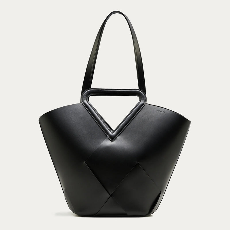 Eine Lederbeutel des Korbs sowohl vorne als auch nach hinten hat einen Hub der Hautflecken, um ein Muster -ähnliches Muster zu bilden. Der Korb kann auf der Schulter getragen werden oder einen weichen Griff halten, dessen Form subtil auf das Herz bezieht und eine Tüte mit einem charmanten, romantischen Charakter hinzufügt. Im Inneren haben wir Ledergurte ein praktisches und elegantes Element der Ausrüstung, mit dem Sie den Inhalt sichern können.