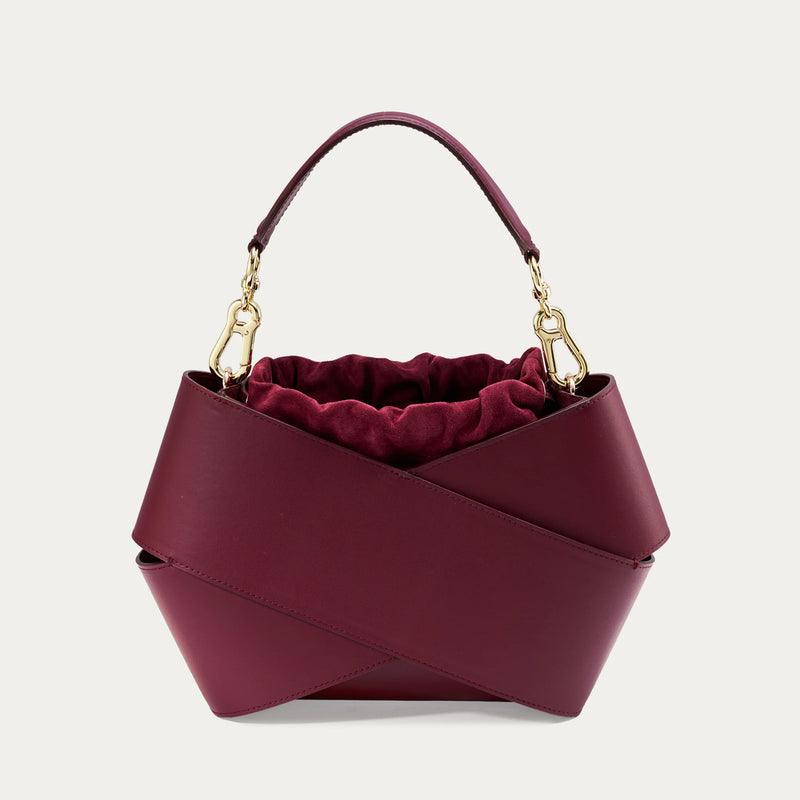 Die Form der Tasche, die aus zwei um einander gewickelten Hautstücke erzeugt wird, erregt mit ihrem modernen Aussehen die Aufmerksamkeit. Im Innenraum gibt es einen losen Beutel, der den Inhalt gegen versehentliche Ausfälle effektiv schützt. Darüber hinaus kann die Tasche leicht ersetzt werden, sodass Sie die Tasche personalisieren und ihm einen neuen Charakter geben können. Die Tasche ist mit einem Schultergurt ausgestattet, der Komfort und einen eleganten Griff mit goldenen Ausstattung bietet. Es ist elegant, aber auch praktisch