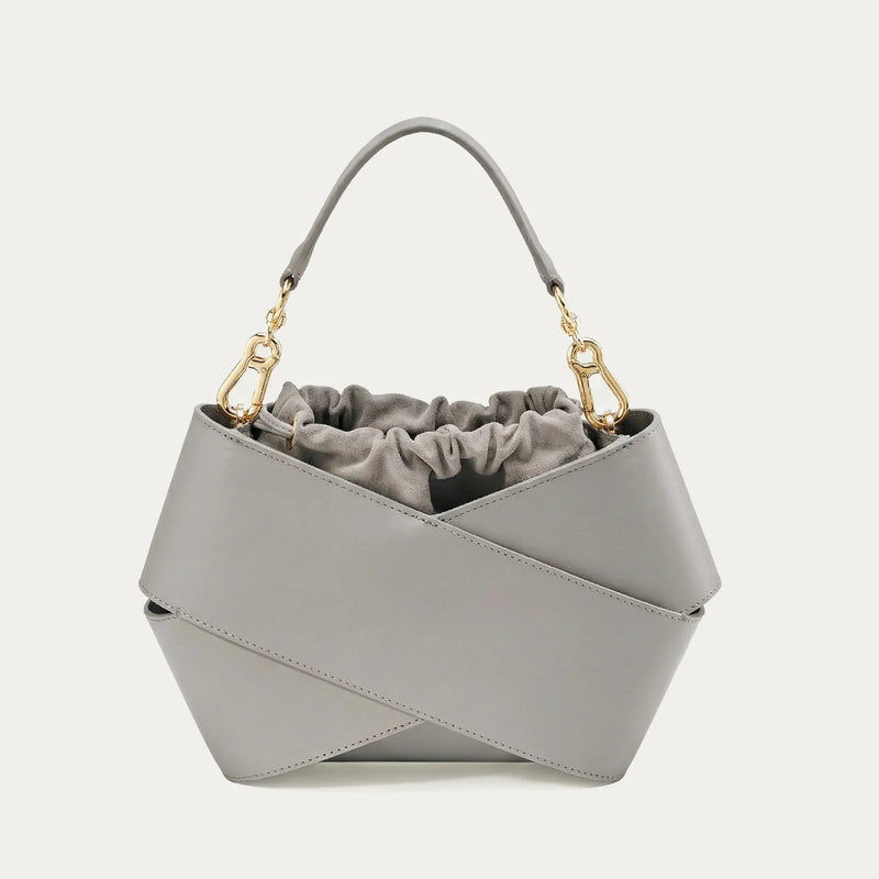 Die Form der Tasche, die aus zwei um einander gewickelten Hautstücke erzeugt wird, erregt mit ihrem modernen Aussehen die Aufmerksamkeit. Im Innenraum gibt es einen losen Beutel, der den Inhalt gegen versehentliche Ausfälle effektiv schützt. Darüber hinaus kann die Tasche leicht ersetzt werden, sodass Sie die Tasche personalisieren und ihm einen neuen Charakter geben können. Die Tasche ist mit einem Schultergurt ausgestattet, der Komfort und einen eleganten Griff mit goldenen Ausstattung bietet. Es ist elegant, aber auch praktisch