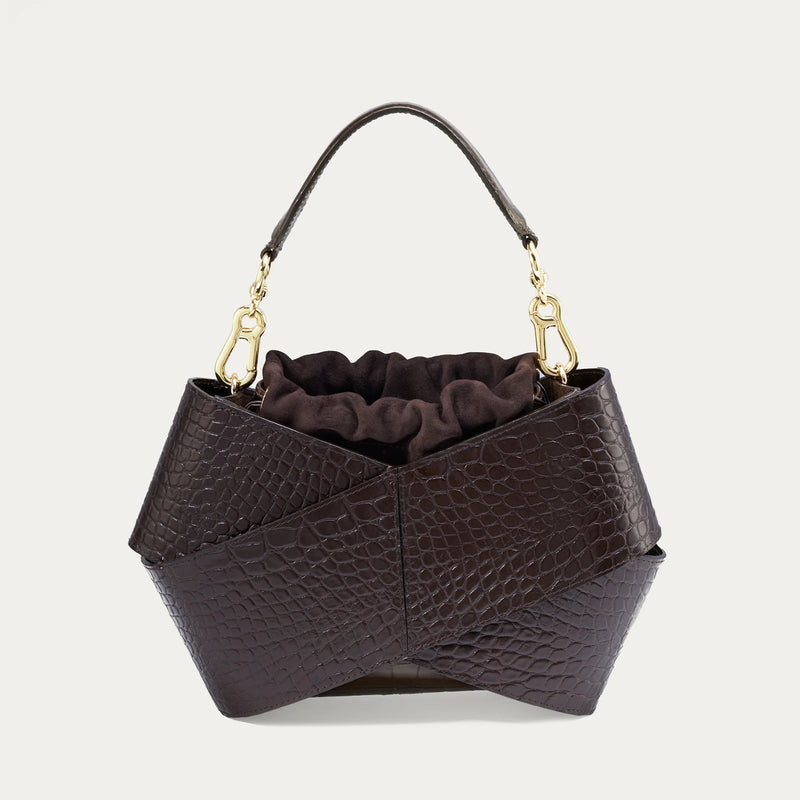 Forma torby, stworzona z dwóch kawałków skóry owiniętych wokół siebie, przyciąga uwagę swoim nowoczesnym wyglądem. W jej wnętrzu znajduje się luzem umieszczony woreczek, który skutecznie zabezpiecza zawartość przed przypadkowym wypadnięciem. Co więcej, woreczek można łatwo wymieniać, co pozwala na personalizację torby i nadanie jej nowego charakteru. Torba wyposażona jest w pasek na ramię, który zapewnia wygodę noszenia, oraz elegancką rączkę ze złotymi okuciami. Jest elegancka ale i praktyczna