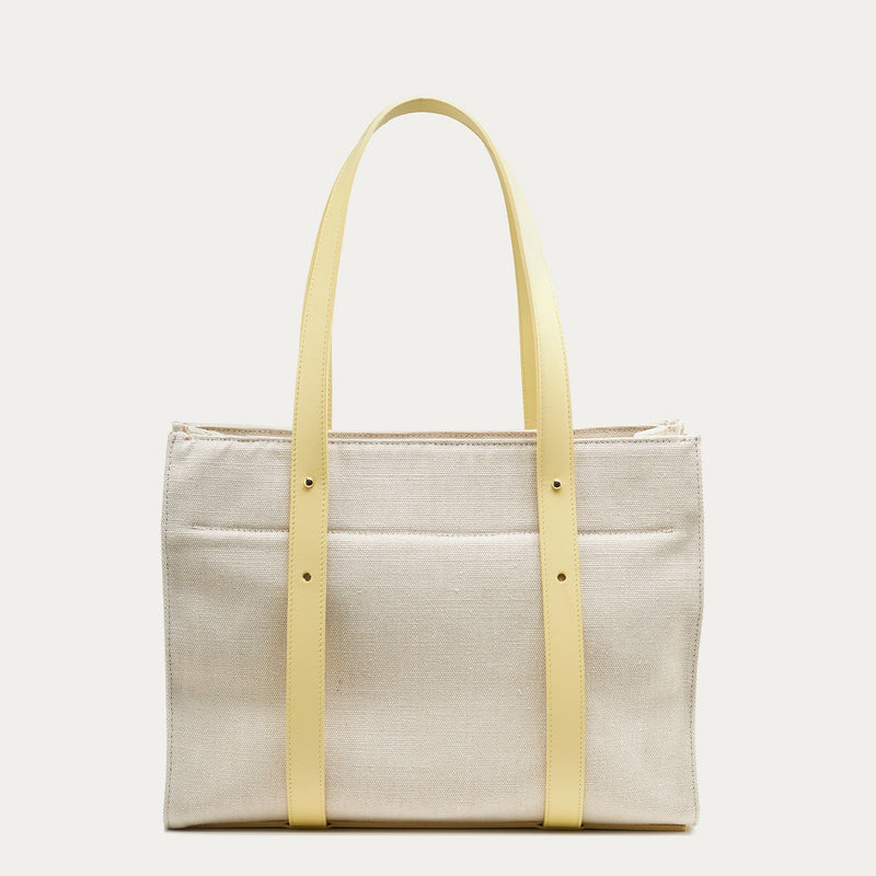 Wykonana w całości z jasnego, naturalnego płótna, z długimi skórzanymi rączkami w różnych kolorach, jest esencją wakacyjnej prostoty. Brak skórzanej ramy sprawia, że torba jest miękka, lekka i elastyczna – gotowa, by towarzyszyć Ci wszędzie tam, gdzie chcesz zabrać trochę lata.